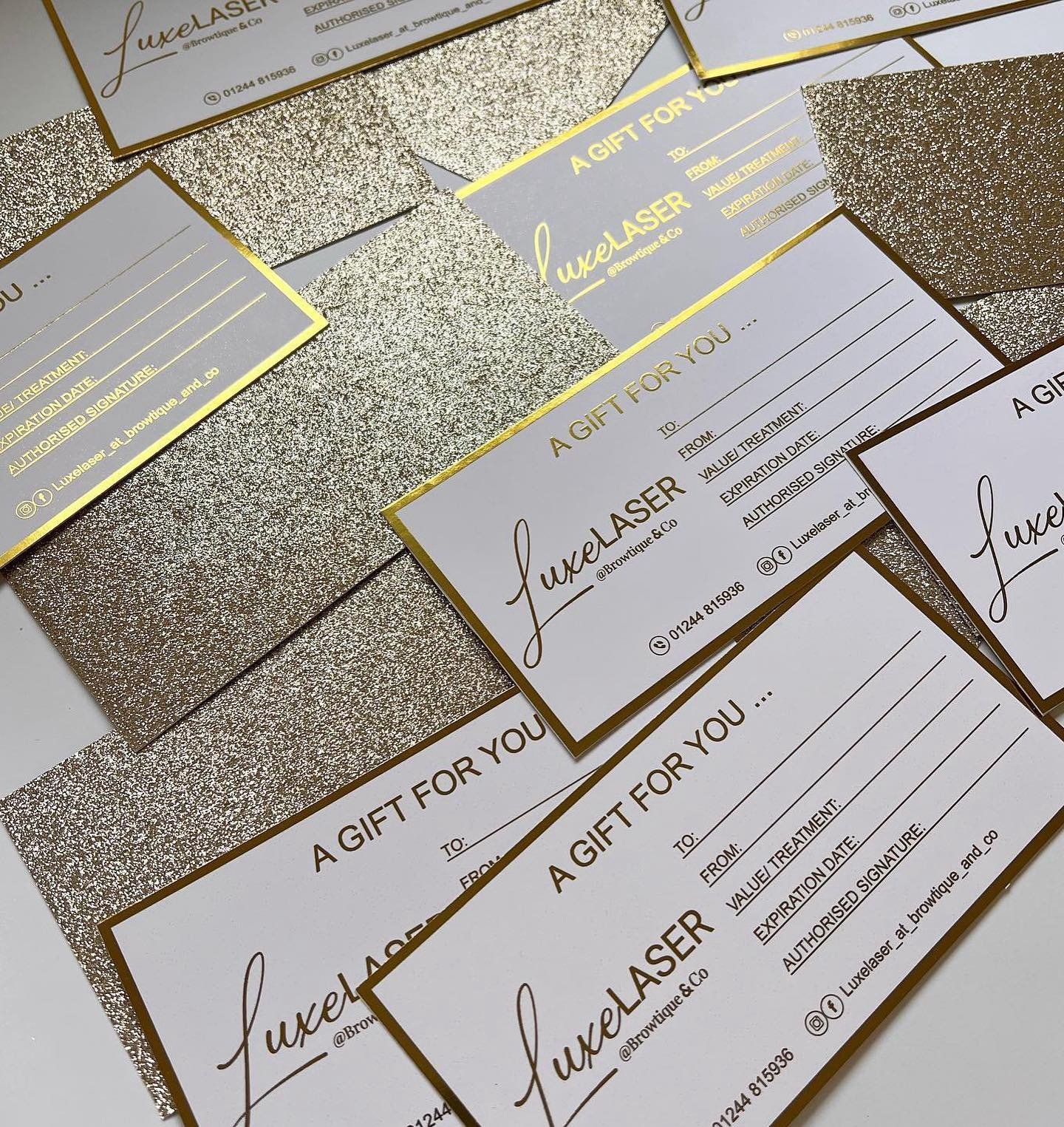 Give the gift of elegance with our Custom Metallic Foil Gift Certificates, designed with a luxurious glitter back. Small businesses can now elevate their gift offerings with a stylish, premium look that reflects their brand’s uniqueness. Choose from a wide range of foil and glitter colors to customize your gift certificates for any occasion.